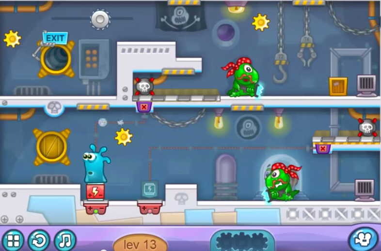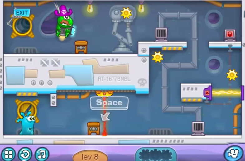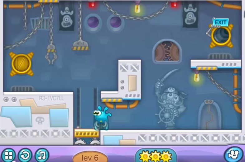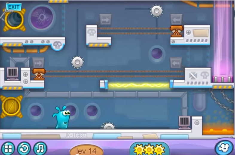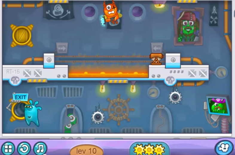 화면처럼 작은 비행선을 타고 젤리 가족이 즐거운 우주여행을 즐기고 있습니다. 그러나 우주 해적단이 공격하고 사랑하는 가족은 모두 납치되는데 주인공은 홀로 악당의 우주선에 들어가 가족을 구하기 위한 자신과의 힘겨운 싸움이 벌어집니다. 미션마다 등장하는 톱니바퀴를 획득하여 더 높은 등급으로 미션을 끝낼 수 있는데, 총 3개를 획득하여 높은 점수를 획득하면서 나갈 수 있도록 하십시오.