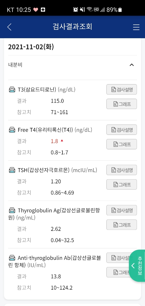 지금 결과를 보는 것이 큰 의미는 없는 것 같다. 앞으로의 추이를 지켜봐야 할 것 같다. 신디로이드 0.075를 먹어서 T4가 좀 높은가 봐. 3개월 뒤에 다시 하면 비교해보자! 선생님 말씀과 함께 기록하러 온다!