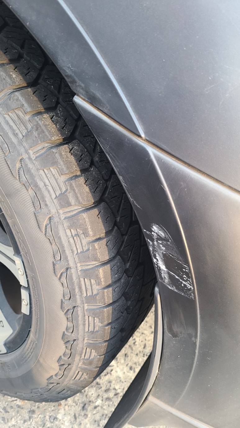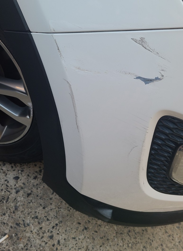 차주는 내가 긁다 보니 왼쪽 이음매가 어긋났다며 쌍용차라서 수리비가 많이 들 것이라고 말했다.
