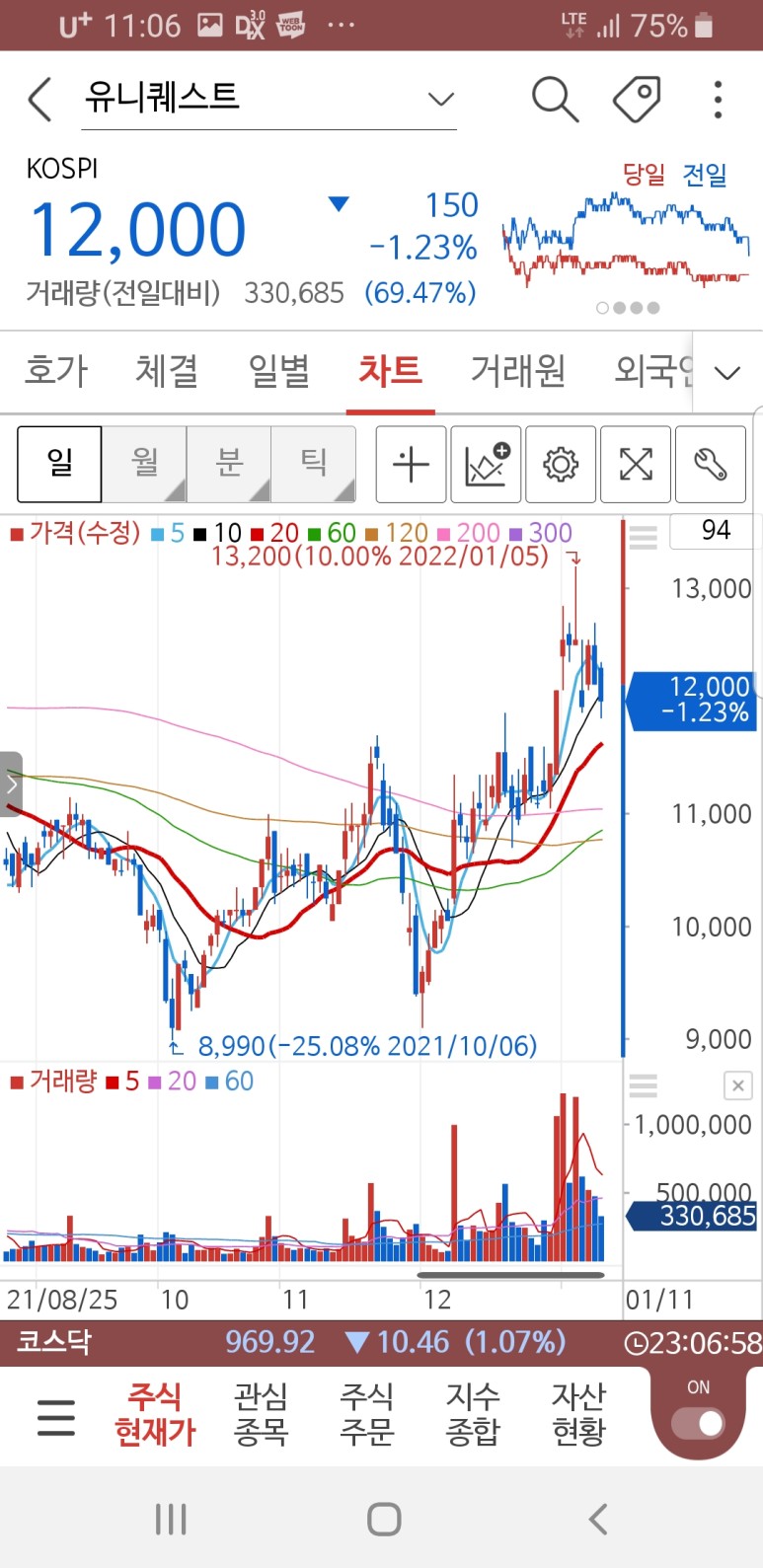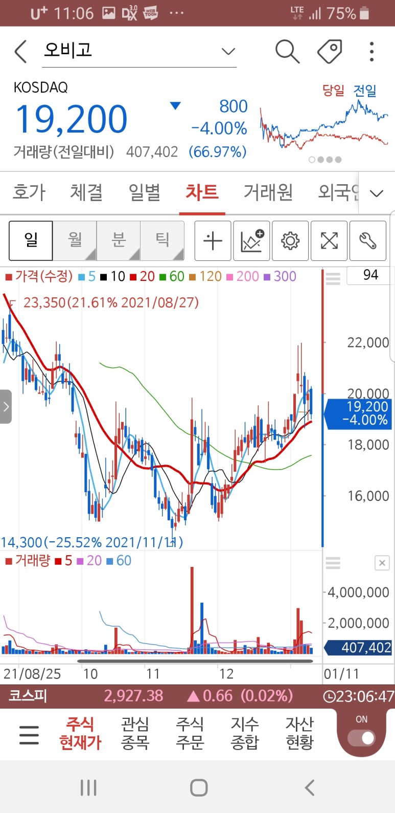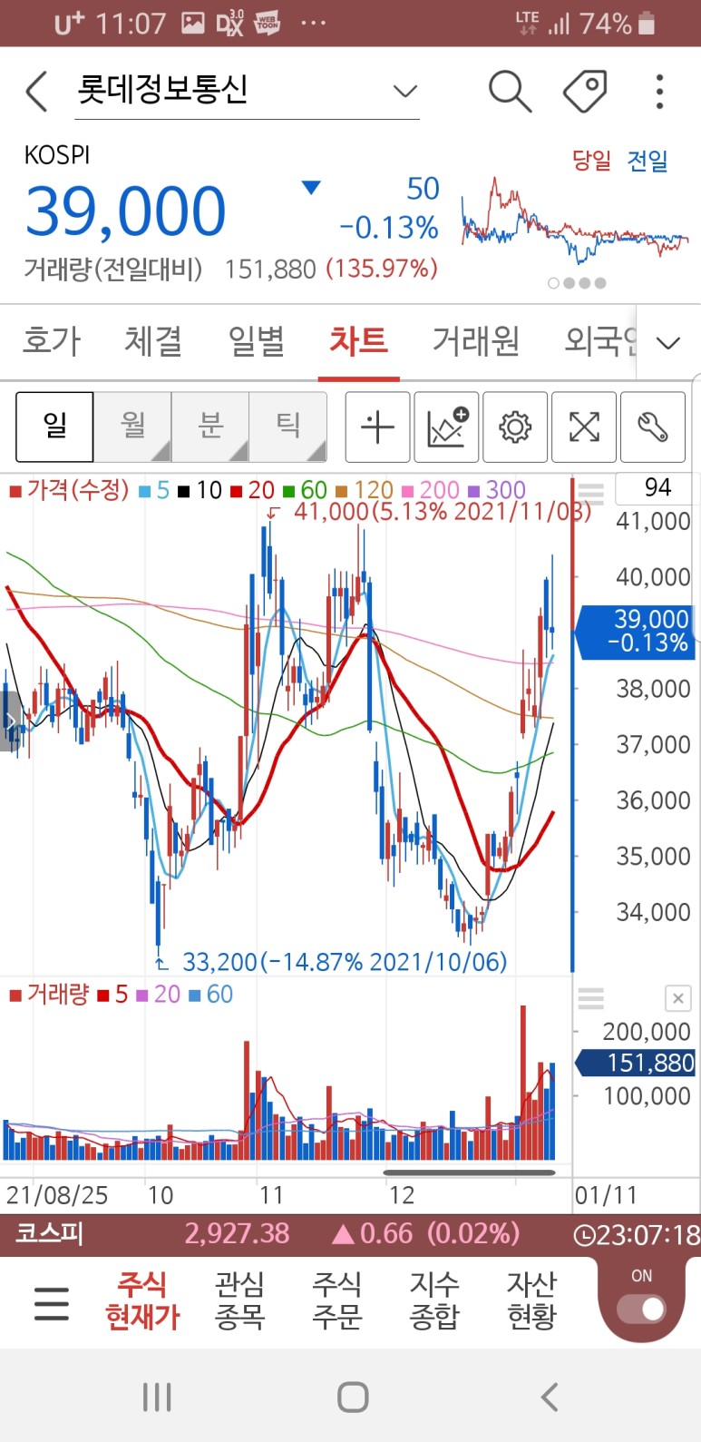 오비고와 롯데정보통신을 관심종목으로 지켜보며 좋은 가격대 진입 기회를 노린다.롯데정보통신은 일단 4만원대가 상당한 매물저항대로 보여 좀 더 낮은 가격대가 유리해 보인다.