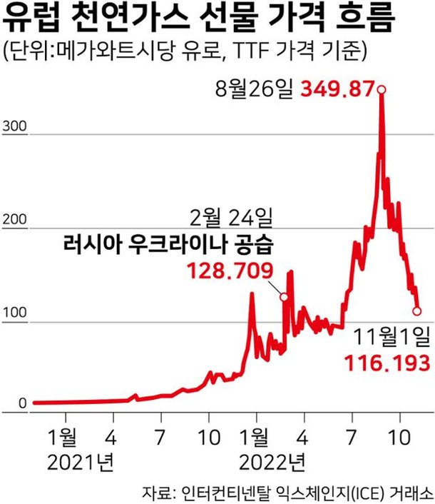 그러나 2월 24일 러시아의 우크라이나 침공 이후 천연가스 가격이 천정부지로 오른다. 네덜란드 TTF 기준 천연가스 선물 가격을 기준으로 봐도 침공 당일에만 50% 상승한 TWh당 132.71유로를 기록했다. 이것이 8월 말에는 TWh당 300유로로 2배 이상 오른 상태다.