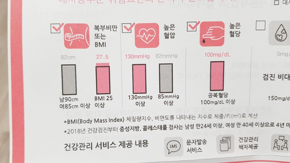 복부비만: 82cm, BMI 27.5높은혈압:130mmHg이상 공복혈당: 100mg/dL이상 공복혈당을 어떻게 딱 100으로 맞췄는지www 이때보다 배가 나오고 살이 쪄서…BMI는 더 높게 나올 것 같다.