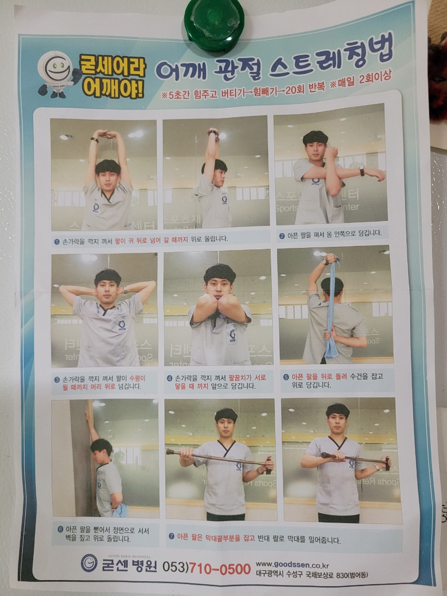 저는 오십견 치료를 위해 대구 청구고등학교 건너편 굿센병원에 다니고 있습니다. 청구고등학교의 제 모교입니다만, 지금은 나이 들어서 오십견 치료를 위해서 자주 만나네요.