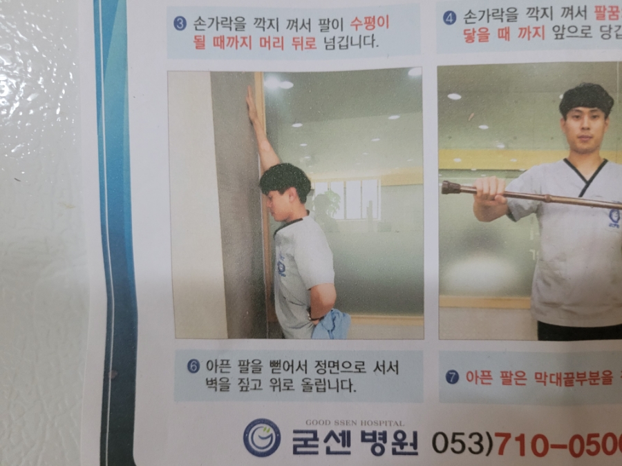 대구 오십견병원에서 많은 동작을 알려줘서 설명을 들었는데 한꺼번에 다 하기에는 아직 어렵더라고요. 저는 하나하나 동작을 늘려서 운동하고 있는데, 아마 오십견이 있으신 분들은 다 저처럼 할 거예요.