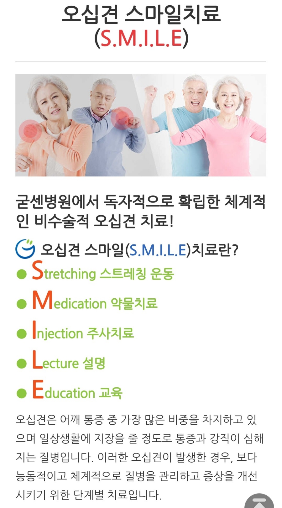 오십견은 꾸준한 운동과 오십견 병원 치료를 병행하여 낳을 수 있는 질환입니다. 저처럼 게으름 피우지 않고 정확한 운동요법을 배워 꾸준히 하면 많이 좋아질 겁니다.