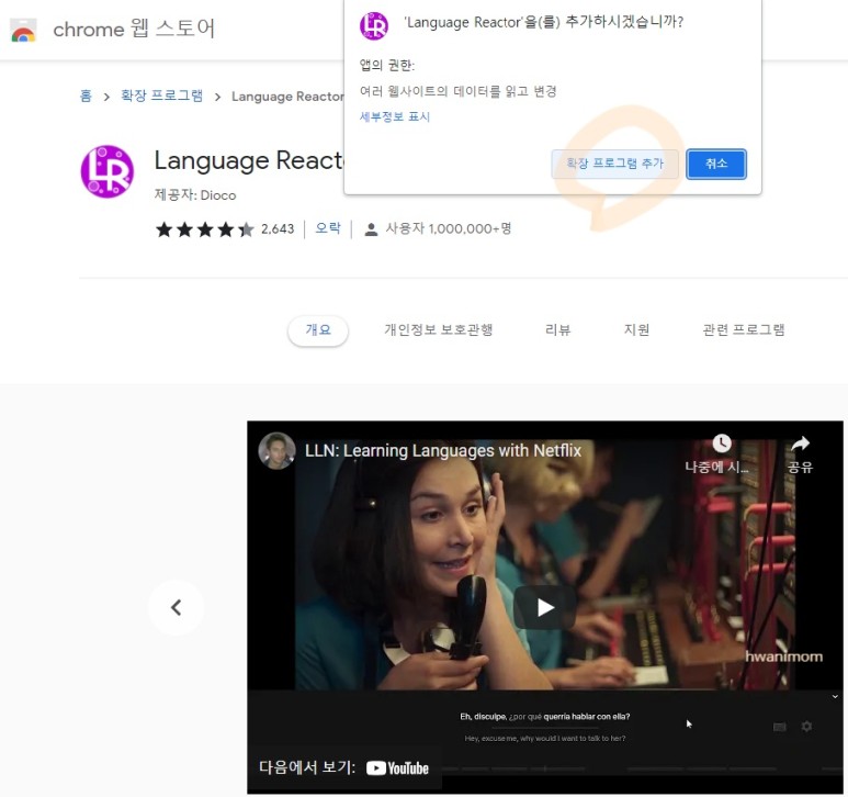 ② ‘Language Reactor’ 확장 프로그램을 추가하여 주십시오.