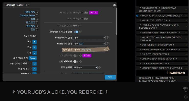 Language Reactor 사이트(오른쪽) ③기존 Netflix창이 열려 있으면 닫아주세요. 구글 크롬에서 다시 넷플릭스 창을 엽니다. 미드 틀어주세요 우측 하단 기어 모양을 클릭합니다. 번역 언어를 ‘한국어’로 설정해주세요. 설정으로 키보드의 단축키를 확인할 수 있습니다.