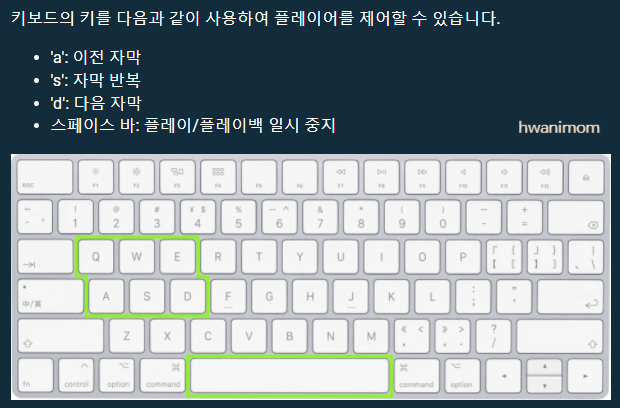 위 영상에서는 키보드 단축키 a:이전 자막, s:자막 반복, d:다음 자막을 각각 3번 눌렀습니다.