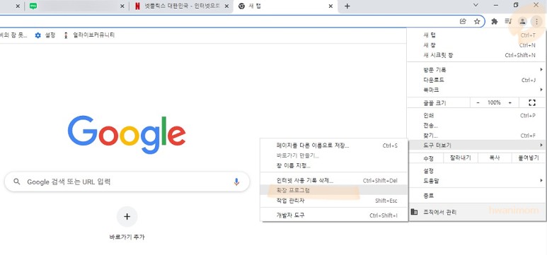 ① Google 크롬에 접속하고 오른쪽 상단의 끝점을 3개 클릭합니다. 도구 더보기 → 확장프로그램 을 클릭합니다.