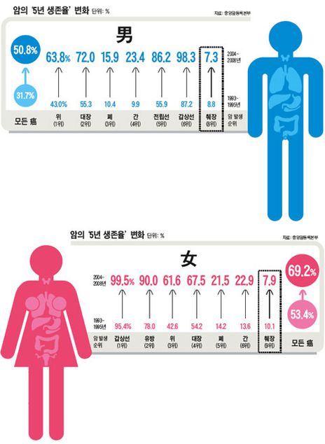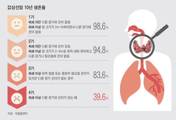 갑상선암의 세포 전이 여부에 따라 생존율이 확연히 다르다.