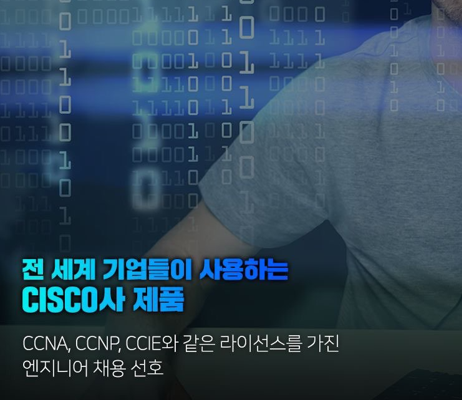 네트워크 장비 회사 중 전 세계적으로 점유율이 가장 높은 시스코사에서 만든 자격증으로 거의 모든 기업이 시스코사 네트워크 장비를 사용하고 있기 때문에 시스코사 자격증이 있으면 네트워크 장비를 취급할 수 있다는 검증을 할 수 있었기 때문에 네트워크 관련 취업에 필요한 자격증입니다