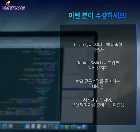네트워크 자격증 CCNA 자격증을 취득하기 위한 교육과정을 네트워크 기초 1개월 과정으로 하여 KG 아이티뱅크가 실시하고 있습니다.