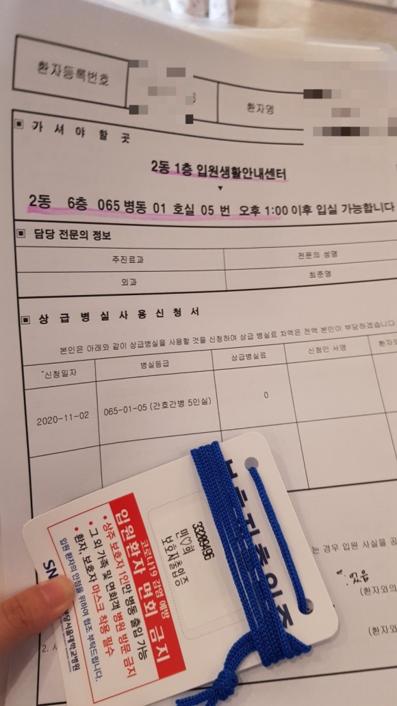 한명실, 2인용, 5인실 입원비의 차이가 나지만 저는 조용한 2실에서 선택함(자리가 없어 5인실 소 하루 자고 이동)
