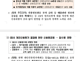 1. 금융권 이용에 의한 평가상의 차등 완화(현황)금융권에서 대출을 받으면 은행권에서 대출을 받는 경우에 비해대출 금리와 대출 유형에 관계 없이 CB사가 산출하는 신용 점수·등급이 상대적으로 크게…를 하락*대출시의 신용 등급 하락 폭:저축 은행 1.6등급, 은행 0.25등급(NICE평가 정보, 2017.3월)(개선)대출 금리·유형 등 대출의 특성을 평가에 반영하고 신용 위험을 세분화하도록 CB사의 개인 신용 평가 체계를 개선 ➊ 제2금융권 이용 시에도 대출 금리의 하락 폭이 낮아지도록 CB사의 평가·평가·평가 등에 대한 통계 분석 등을 거치며 대상 금리 수준을 결정-상호 금융·여신 전문 금융권 등에 대해서는 추가 통계 분석 등을 통해서 대상 대출 금리 수준을 확정하는 2019.6월 중 시행에 들어갈 계획