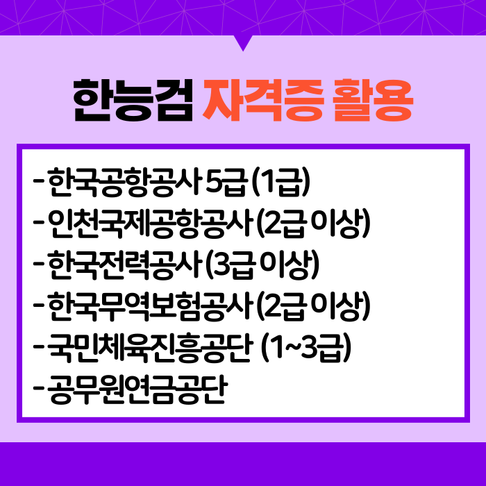 “한국공항공사, 인천국제공항공사, 한국전력공사, 한국무역보험공사, 국민체육진흥공단, 공무원연금공단 등 여러 공기업에서도 한능검을 가산점으로 부여하고 있습니다”