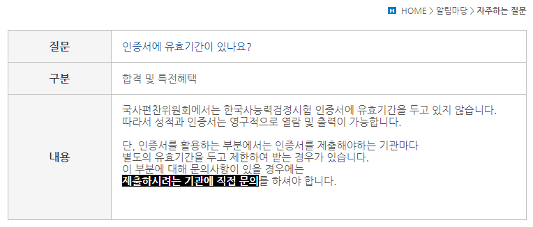 인증서를 활용하는 부분에 있어서 제출하는 기관에 따라서 한국사 자격 유효기간이 있는데요.