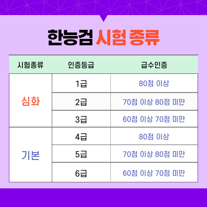 국사능력검정시험 심화과정은 1급부터 3급까지 취득할 수 있습니다.한국사능력검정시험의 기본과정은 4급부터 6급까지 취득할 수 있습니다.