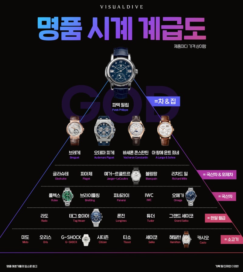 C:노모스, 래드, 보메 메르시에, 프레데릭 콘스탄트, 튜더B:태그호이어, 벨앤로스, 론진, 몽블랑, 에르메스B+:오메가, 브라이트링, 파넬라이, 코람, 불가리B클래스부터는 워치에 별 관심이 없는 저도 아는 브랜드들이 슬슬 등장하기 시작하네요.주로 30대, 40대가 착용하는 남성용 시계가 많이 분포하는 라인이기도 합니다.론진태그호이어는 손흥민 선수가 모델이고 론진 같은 경우는 요즘 드라마에서도 협찬으로 많이 보거든요?인지도를 점점 높이고 있는 것 같다.아무튼 C에서 B라인까지 오면 기본적인 금액은 400~500만원 사이로 껑충 뛰어오릅니다(^^) 남자들의 시계세계란…A: 위브로, IWC, 롤렉스, 카르티에, 반클리프 앤 아펠 A+: 제니스, 쇼퍼드, 헬리윈스턴, 율리즈널든, 리처드 밀 A클래스에 오르면 억대가 넘는 시계가 등장합니다.그런데 현실은 이 위에 더 높은 등급이 있다는 거.www특히 롤렉스는 정가로 구매하는 것이 거의 불가능하기 때문에 프리미엄을 붙여 구매해야 할 정도로 남성시계 계급도 중에서도 인기, 인지도가 상당히 높은 브랜드 중 하나입니다.A클래스에서도 그렇게 인기가 많고 고가의 시계가 많았지만 S, BIG5는 넘을 수 없는 벽이라고 할 수 있습니다.S:랑에운드체크네,예글쿠르트,블랑팡,자케드로,질라드페르고,그뤼벨포지BIG5:파텍필립,바쉐론콘스탄틴,브레게오데마피게라스는집한채가아니라10채나가볍게살정도의가격대의모델도많죠?..현실적으로구매가가능할까생각도들고,그사세가아닌가싶습니다.www출처 : 필웨이남자 시계 계급도 외에 2022년도에 실질적으로 인기 있는 거래가 많았던 TOP 10 브랜드 목록입니다, 역시 롤렉스가 1위를 차지하고 있었어요?그 뒤로는 오메가, 태그호이어, 까르띠에 순으로 인기가 많아요!위에서 살펴본 순위와 실질적인 인기도는 조금 다른 결과죠?오늘 이렇게 남성시계, 지갑 계급도를 알아보고 2022ver. 인기도 높은 BEST 10까지 함께 체크해봤습니다.알려진 계급과는 달리 실제 거래가 많은 브랜드는 조금 차이가 있었던 것 같아요!어디까지나 참고만 하시고 재미삼아 봐주셨으면 좋겠습니다. : )20대, 30대 남자지갑 클러치백 계급도 추천정리 (f. 카드지갑) 안녕하세요 초입니다! 처음 남자지갑 계급도가 등장한 지 2년 정도 시간이 지났는데 아직도 그 인기가.blog.naver.com20대, 30대 남자지갑 클러치백 계급도 추천정리 (f. 카드지갑) 안녕하세요 초입니다! 처음 남자지갑 계급도가 등장한 지 2년 정도 시간이 지났는데 아직도 그 인기가.blog.naver.com20대, 30대 남자지갑 클러치백 계급도 추천정리 (f. 카드지갑) 안녕하세요 초입니다! 처음 남자지갑 계급도가 등장한 지 2년 정도 시간이 지났는데 아직도 그 인기가.blog.naver.com