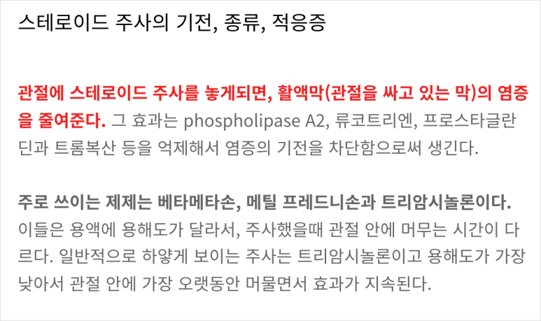 여러 검사로 원인이 밝혀졌고 의사들은 교과서대로 스테로이드제를 처방했다. 손목에 스테로이드 주사를 놓는 것인데 이의 효과 및 작용은 다음과 같다.