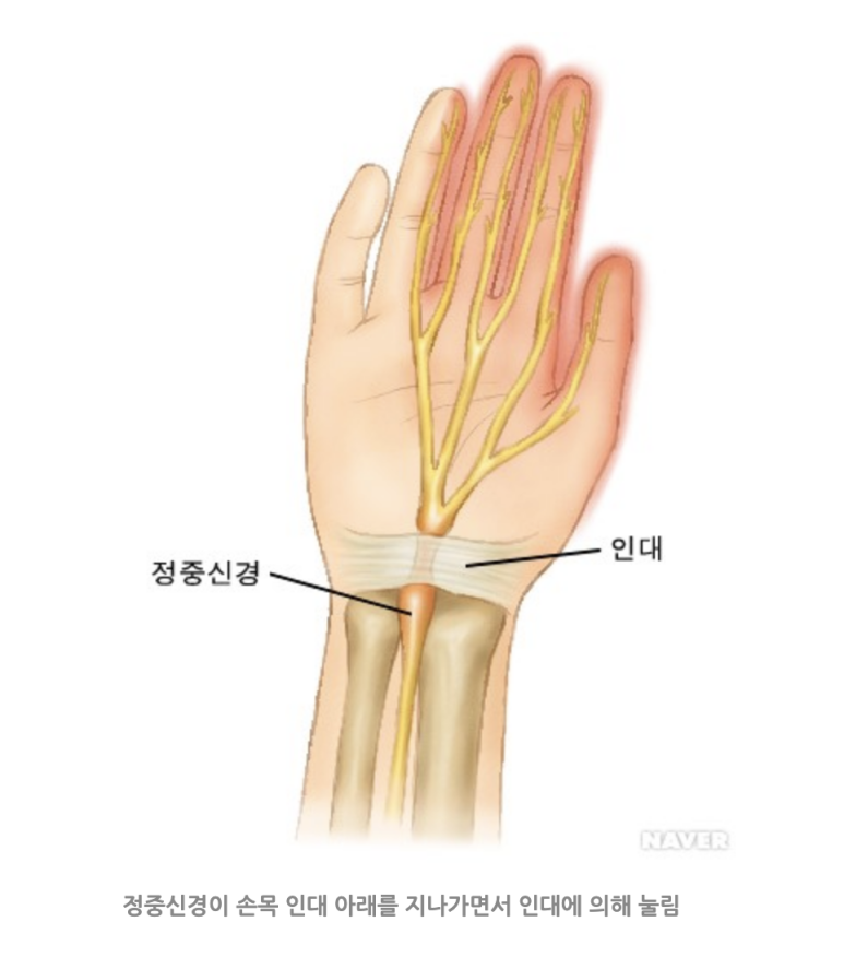 잘 이해가 가지 않지만 왼손이 손목터널증후군 증세라고 한다.왜 이해가 안 가냐면 그동안 마우스를 잡고 오른손으로 거의 일했는데 상대적으로 일이 적은 왼손이 그런 진단을 받으면 오른팔 입장에서는 어처구니가 없다. 우선 팔 저림이 가슴 가까운 팔에서 팔꿈치를 지나 손가락 끝까지의 범위가 클 수 있는데 그 문제의 원인이 손목 인대 측이 정중신경을 압박해 생기는 것이라는 것이다. 그러니까 쉽게 말해 손목 부위만 놓고 약물치료나 수술 등의 치료를 하면 팔 전체의 저림증상이나 통증이 없어진다는 것이다.