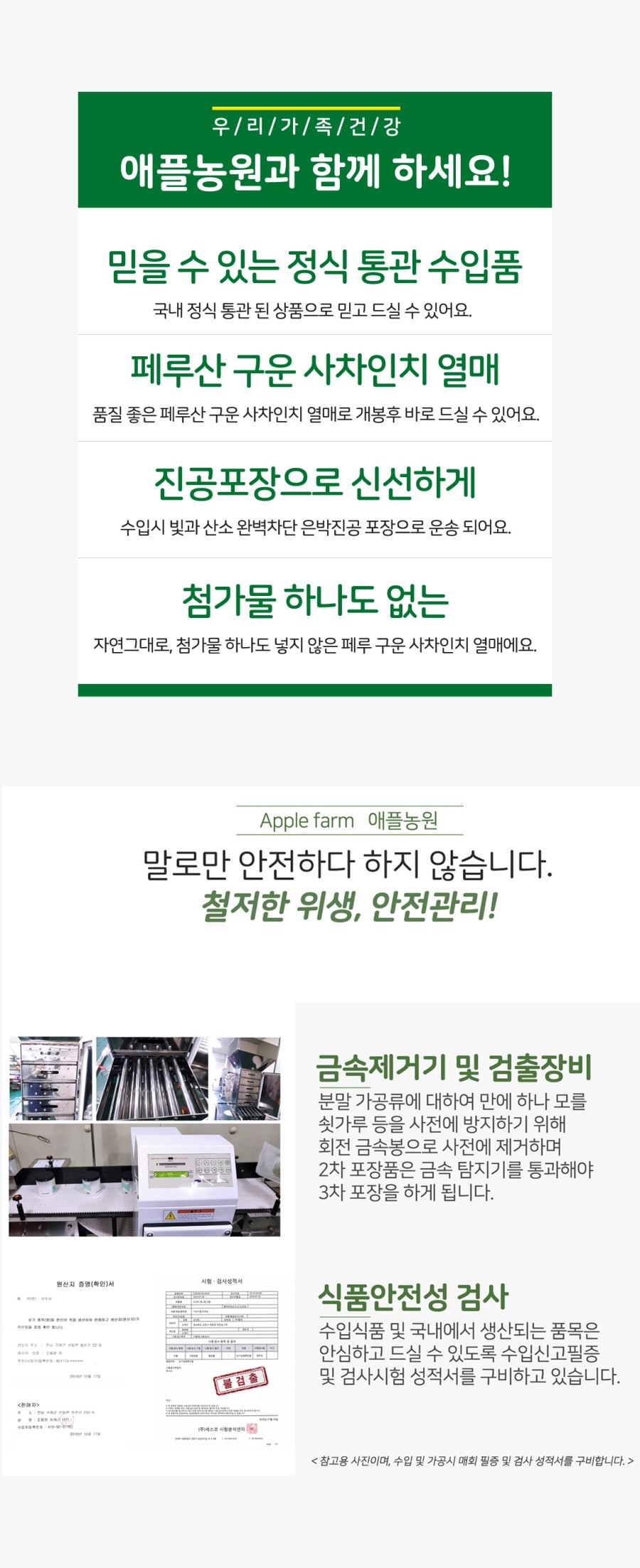 수입검사 성적서를 구비하여 최근 한달 이내에 입고된 신선한 제품만을 소개합니다.