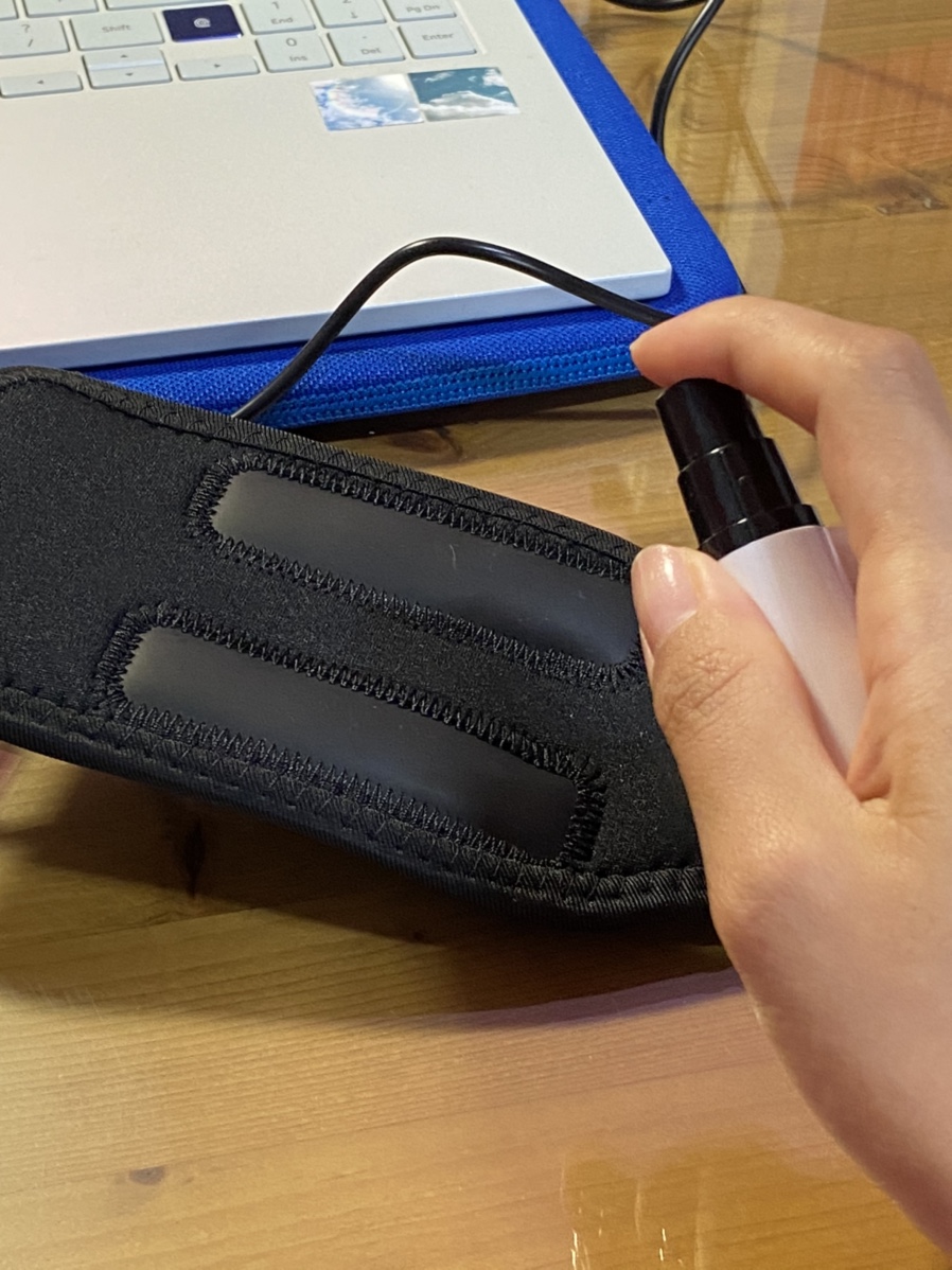 손목보호대 EMS밴드 안쪽에 저렇게(오른쪽 사진) 2개로 맨질한 부분이 있는데, 그곳이 전극패드로 물을 채운 워터 스프레이로 약 5번 물을 분사합니다.