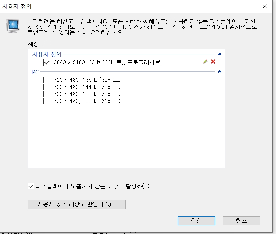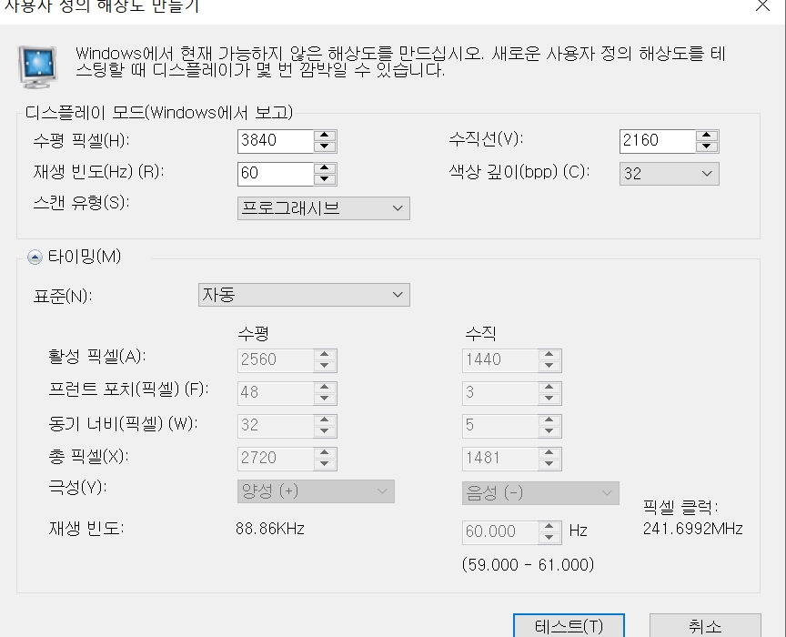 여기서 3840x2104KUHD 해상도를 입력해 주시고 재생빈도는 60Hz로 설정해 주세요. 제 모니터로는 4k144,165Hz가 되지 않았습니다. 테스트 버튼->확인