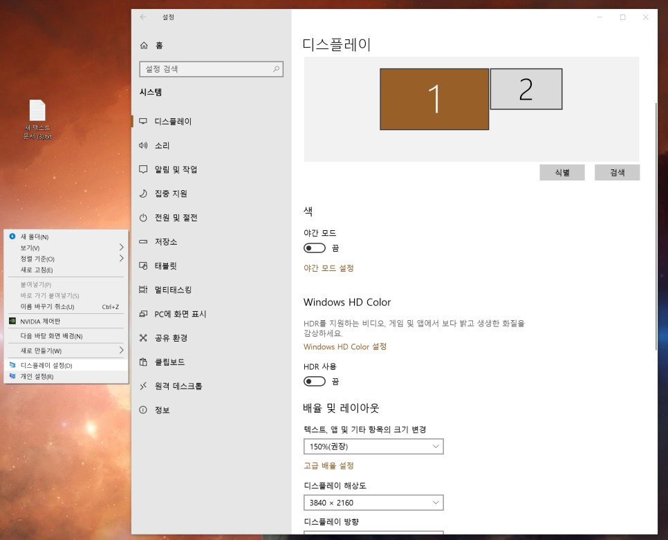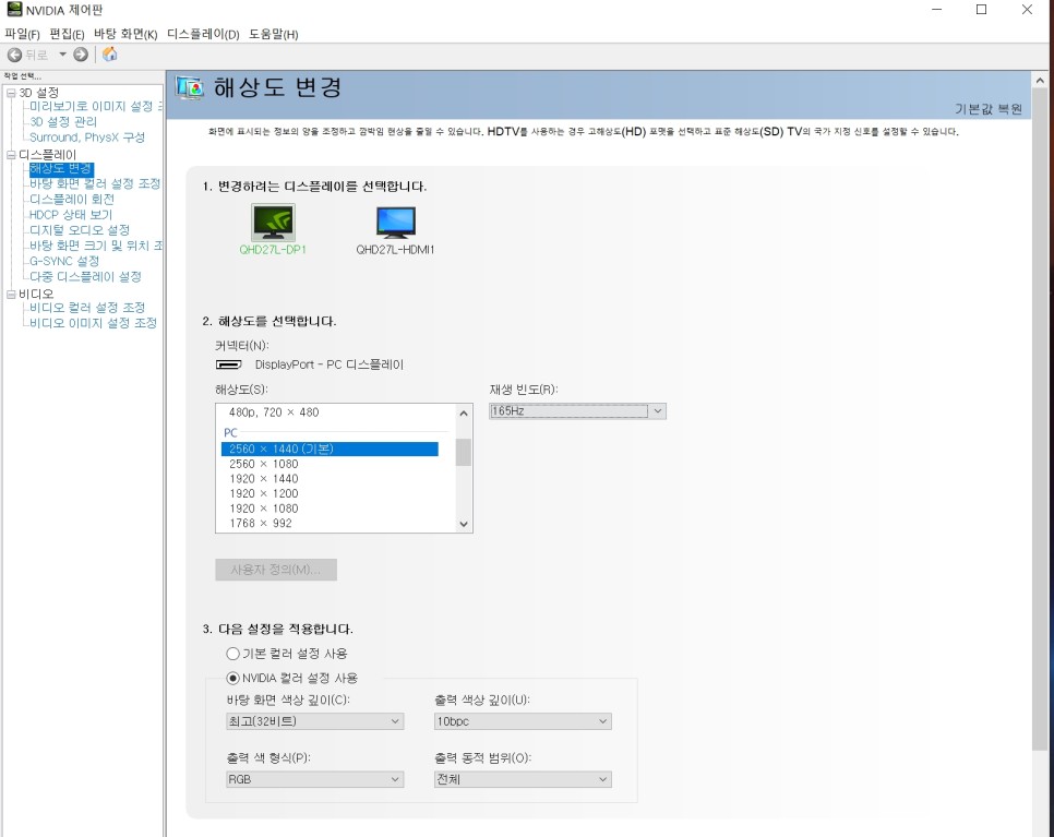 마우스 오른쪽 버튼, 디스플레이 설정, 디스플레이 해상도에서 3840×2160이 표시되었을 것입니다. 이거 눌러주세요. 만약 안된다면, NVIDIA 제어판에서 방금 추가한 4K 해상도를 설정해 주세요.