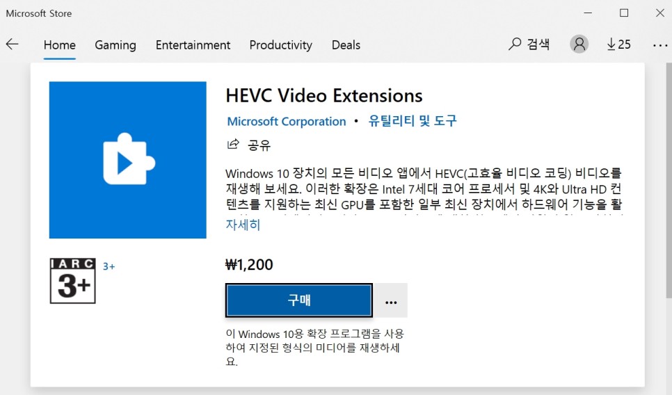 다음으로 윈도우10 정식 스토어에서 EHVCVideoExtensions 코덱이 필요합니다. 1200원짜리인데 충분히 투자할만해요~