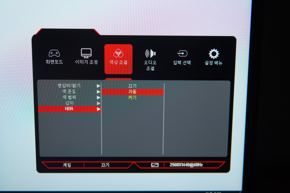 모니터에서 HDR을 지원해야 합니다. 모니터마다 OSD 설정이 참고로 다릅니다. 메뉴를 찾는 건 어렵지 않을 거예요. 모니터에서 HDR을 먼저 설정해주세요.