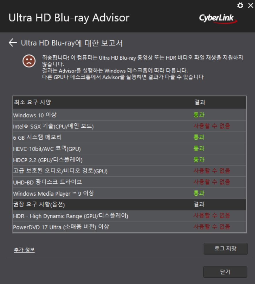 UltraHDBlu-ray재생확인기 다운로드 CyberLinkUltraHDBlu-ray재생확인기 당신의 컴퓨터는 UltraHDBlu-ray &Blu-ray디스크 재생을 지원합니까? CyberLinkUltraHDBlu-ray재생확인기에서 확인해 보세요. 이름: 이메일: 국가: 정보를 제공하는 것은 CyberLink의 개인정보 보호 정책에 동의하는 것입니다. 가입: CyberLink 제품 업데이트 가입 현재 빌드 정보: 빌드 번호:: 2.0 출시일: 10-8월-2018 파일 크기: 19.23MB… kr.cyberlink.com 위의 사이버링크 블루레이 디스크 지원 프로그램을 설치하여 확인하는 방법이 가장 정확합니다. 위스샷을 보면 HDCP 2.2→통과 녹색 문자로 표시돼야 넷플릭스 4K 화질을 감상할 수 있습니다.