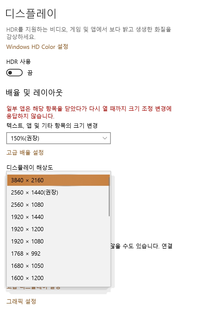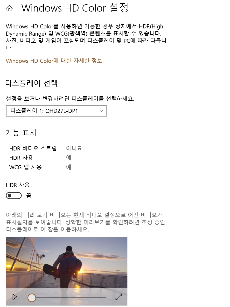 여기서 가운데 HDR 사용을 누르십시오. 참고로 이 글의 4K 방법과 HDR은 함께 활성화되지 못했습니다. 모니터마다 다른 것 같아요. 제 모니터는 안되네요.