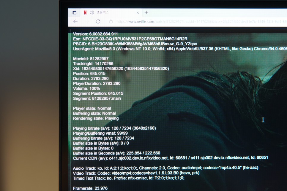 해상도 확인은 넷플릭스 앱에서 키보드 컨트롤+알토+시프트+D를 누르면 위 화면처럼 나타납니다. 저기서 Playingbitrate에 해상도가 보입니다. 이유는 모르겠지만 저는 윈도10 앱에서는 안 올라가요.