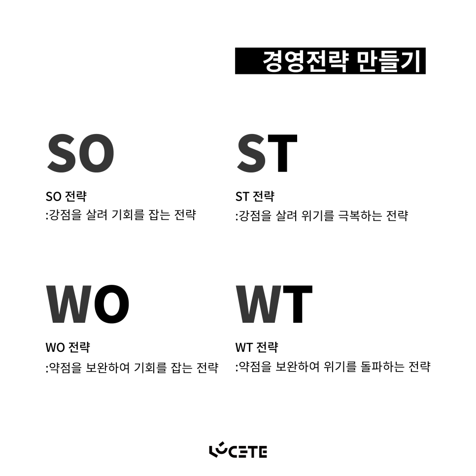 - 강점을 살리고, 약점을 보완하고, 기회를 살려서 활용하고, 위기는 피한다!