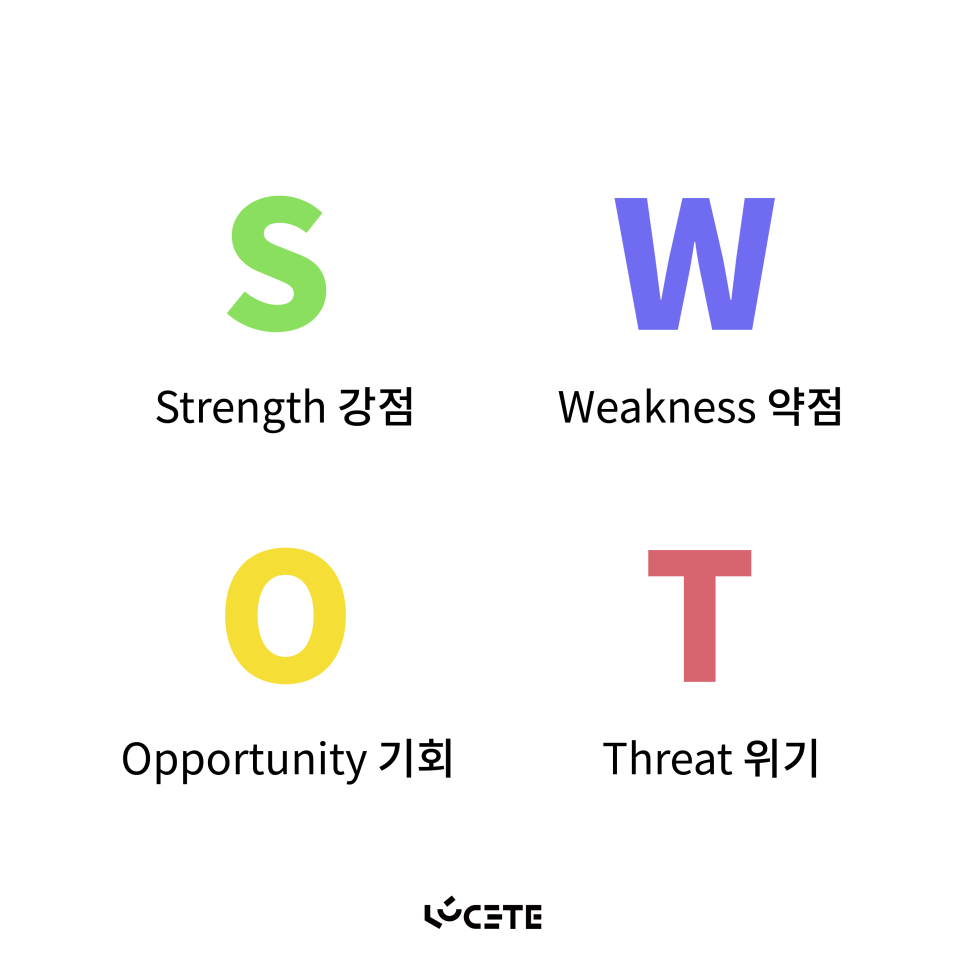 - SWOT란 무엇의 약자?S:Strength (강점) W:Weakness (약점) O:Opportunity (기회) T:Threat (위기)