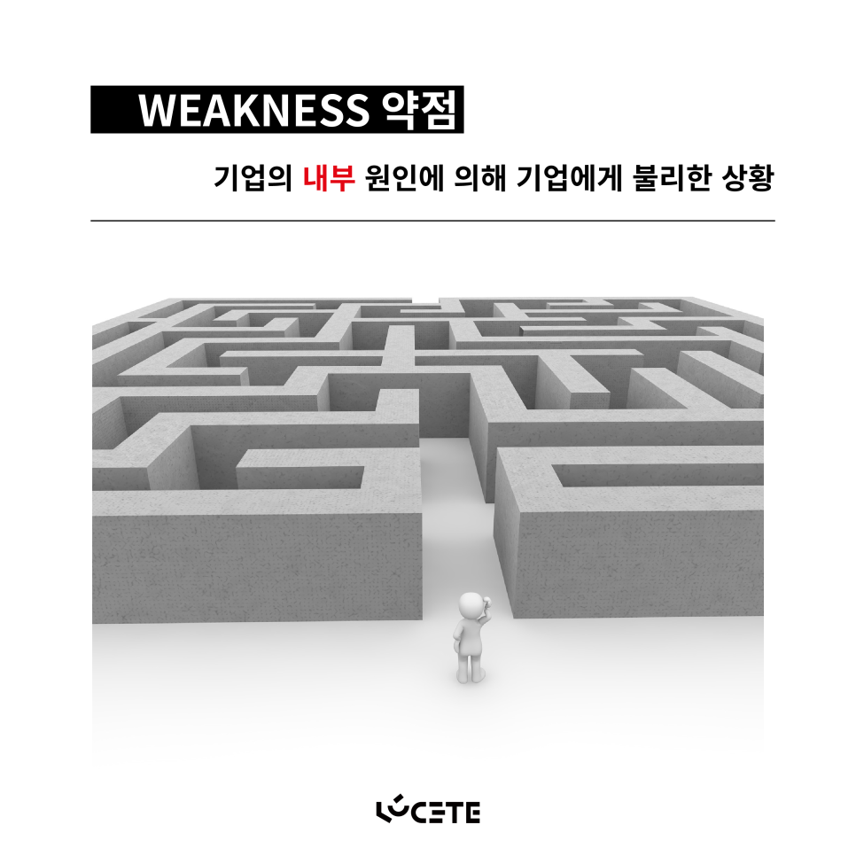 - Weakness 약점 : 기업의 내부 원인에 의해 기업에 불리한 상황.(생산원가, 공장위치, 생산과정, 기계 및 인력 등.ex) 샌드위치 브랜드 서브웨이 주문방법의 어려움