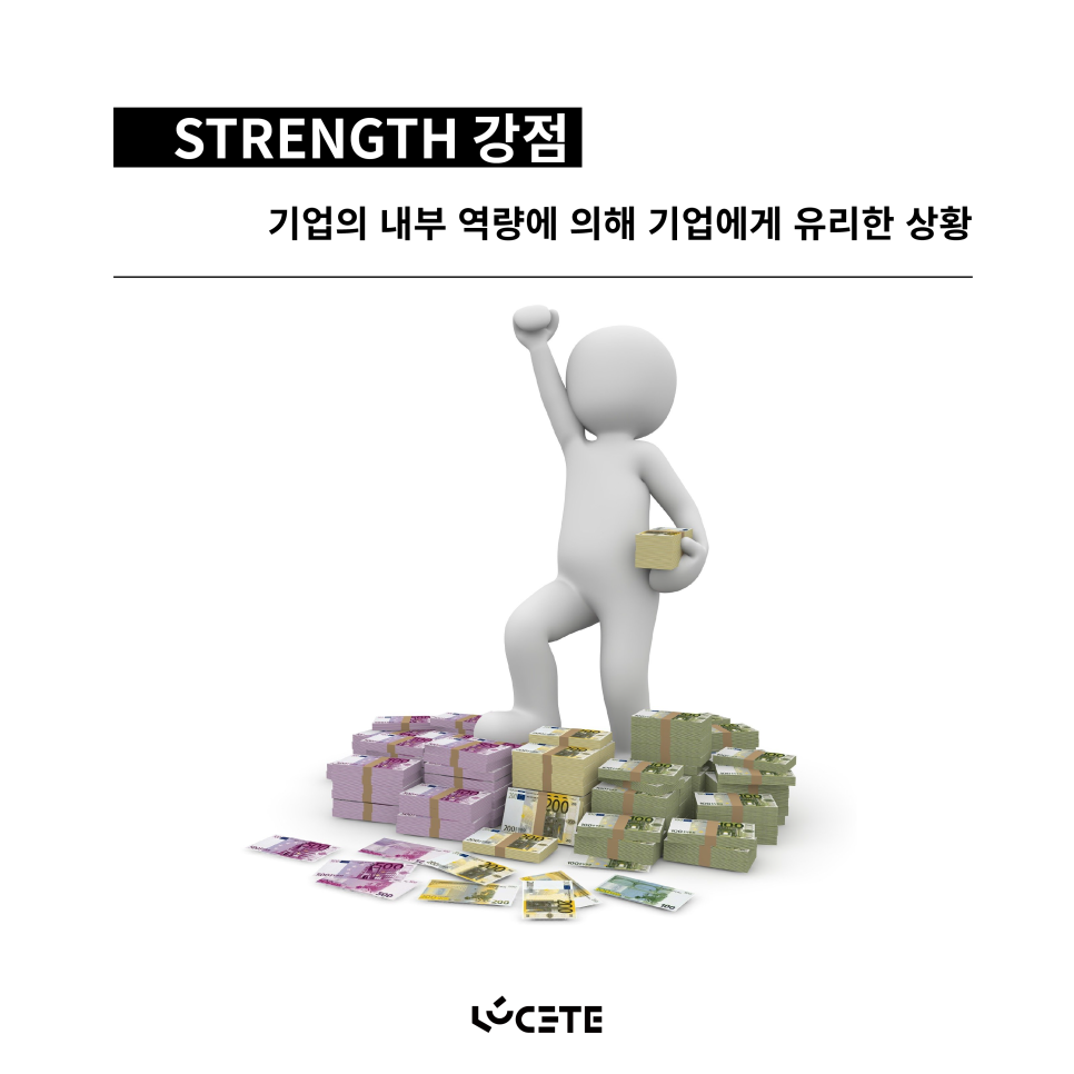 - Strength 강점 : 기업 내부력 양으로 인해 기업에게 유리한 상황.ex) 해당 기업만이 갖고 있는 기술력, 제품의 질, 생산시스템, 내부경영제도 등.ex) 애플사의 아이폰만의 디자인 감성