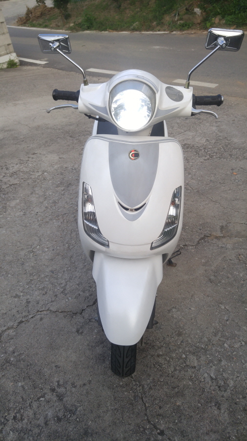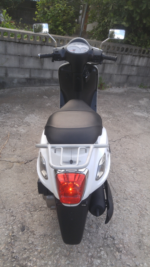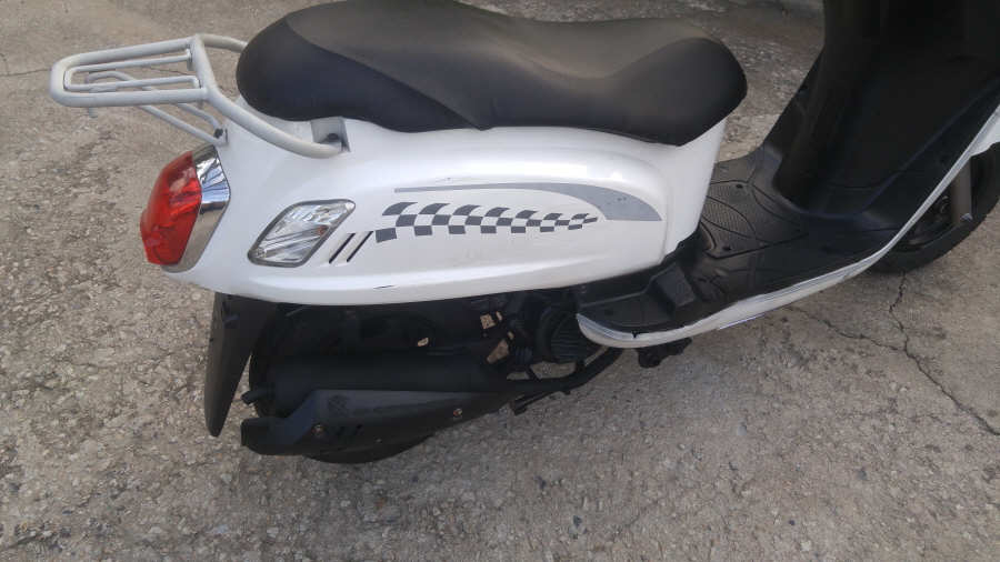 피엘엑스라는 SY M 회사의 모델입니다화이트 컬러로 되어 있는 모습이죠.전체적인 모습은 각진 모습이 아닙니다. 시트 아래쪽도 약간 요철이 있어, 데칼로 되어 있습니다. 피들 룩스라는 엠블럼은 특별히 없는 상태로, 일반적으로 보디 카울 쪽에 엠블럼이 붙어 있습니다.엠블럼이 없다고 문제가 있는 건 아니에요. 뒤쪽에는 탠덤 손잡이 대신 작은 짐을 실을 수 있는 공간이 있습니다 저 부분에 톱박스를 장착해도 될까요? 그리 크지 않은 크기로 발판 아래에 잘 보이지 않지만 LED가 보입니다.밝은 대낮이라 저 부분이 허약해 보이는군요. LED 같은 경우도 장착이 길어지거나 하면 밝기가 좀 약해지는 것 같아요 최근에는 마르기 쉬운 추세이지만 가급적 장착되어 있어도 불이 약하면 교체하는 것을 추천합니다.